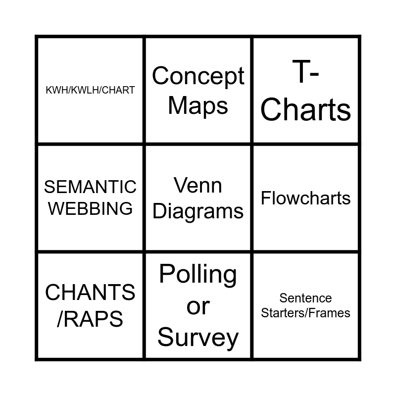 This bingo card has 12 words: Open-Ended Questions, Sentence Starters/Frames, Venn Diagrams, Flowcharts, Concept Maps, T-Charts, Polling or Survey, FRAYER MODEL, KWH/KWLH/CHART, SEMANTIC WEBBING, CHANTS /RAPS and Exit Tickets.