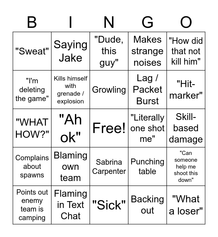 This bingo card has a free space and 24 words: Blaming own team, Flaming in Text Chat, Growling, Points out enemy team is camping, "How did that not kill him", "Sweat", "I'm deleting the game", Saying Jake, "Literally one shot me", Sabrina Carpenter, Lag / Packet Burst, "WHAT HOW?", Punching table, "Can someone help me shoot this down", Kills himself with grenade / explosion, Backing out, Skill-based damage, "Dude, this guy", "Hit-marker", "Ah ok", "What a loser", Complains about spawns, Makes strange noises and "Sick".