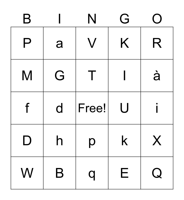 This bingo card has a free space and 60 words: A, B, C, D, E, F, G, H, I, J, K, L, M, N, O, P, Q, R, S, T, U, V, W, X, Y, Z, é, è, à, ç, ù, â, ê, ô, a, b, c, d, e, f, g, h, i, j, k, l, m, n, o, p, q, r, s, t, u, v, w, x, y and z.