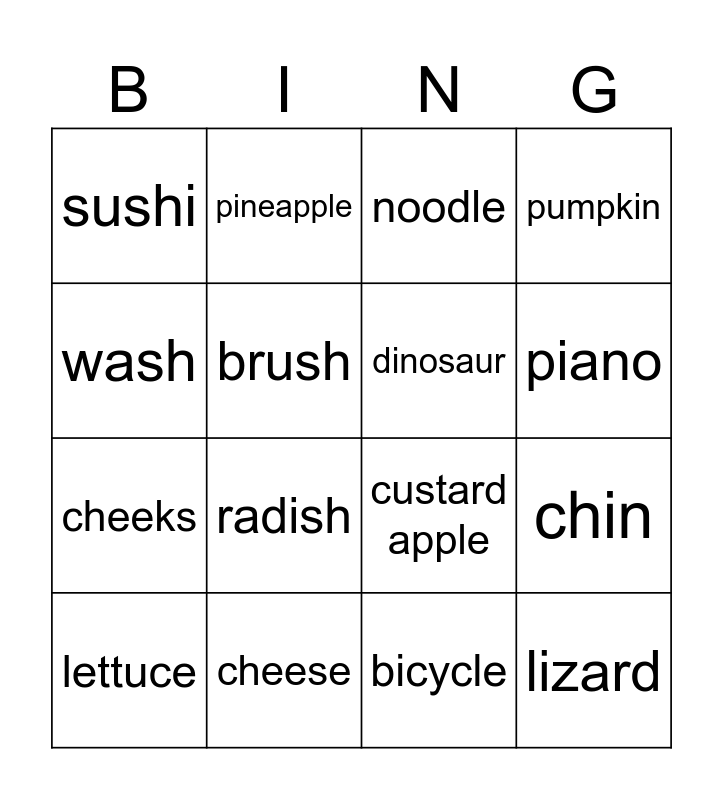 This bingo card has 16 words: cheese, chin, noodle, sushi, cheeks, pineapple, custard apple, bicycle, wash, brush, lettuce, pumpkin, radish, piano, dinosaur and lizard.