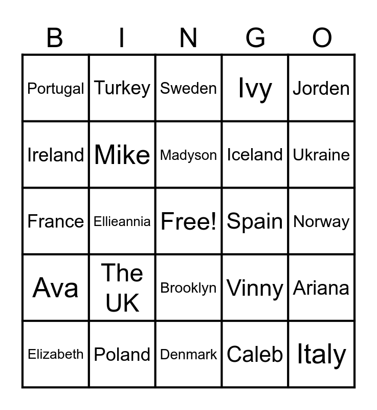 This bingo card has a free space and 39 words: Serenity, Aaliyah, Ari, Mike, Elizabeth, Brooklyn, Madyson, Macie, Jorden, Ava, Ellieannia, Ivy, Italy, Norway, Spain, The UK, Findland, Portugal, Albania, Vinny, Ireland, Denmark, Iceland, Ukraine, Romania, Belgium, Germany, Austria, Greece, Turkey, Luxembourg, Switzerland, Sweden, Poland, Caleb, Karlee, Ariana, France and Bulgaria.
