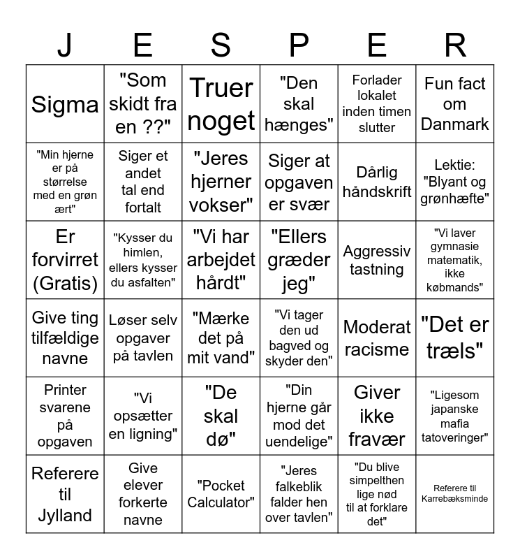 This bingo card has 36 words: "Din hjerne går mod det uendelige", "De skal dø", "Jeres falkeblik falder hen over tavlen", "Min hjerne er på størrelse med en grøn ært", Give ting tilfældige navne, "Ellers græder jeg", Siger et andet tal end fortalt, "Pocket Calculator", Forlader lokalet inden timen slutter, Giver ikke fravær, Lektie: "Blyant og grønhæfte", "Den skal hænges", "Ligesom japanske mafia tatoveringer", "Kysser du himlen, ellers kysser du asfalten", Siger at opgaven er svær, Sigma, Printer svarene på opgaven, Aggressiv tastning, Er forvirret (Gratis), Truer noget, "Vi har arbejdet hårdt", Løser selv opgaver på tavlen, "Vi tager den ud bagved og skyder den", "Mærke det på mit vand", Moderat racisme, "Som skidt fra en ??", Dårlig håndskrift, Give elever forkerte navne, "Jeres hjerner vokser", Fun fact om Danmark, Referere til Karrebæksminde, Referere til Jylland, "Det er træls", "Vi laver gymnasie matematik, ikke købmands", "Vi opsætter en ligning" and "Du blive simpelthen lige nød til at forklare det".