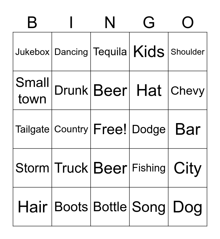 This bingo card has a free space and 33 words: Guns, Home, Country, Mud, Storm, Drunk, Shoulder, Hair, Dancing, Whiskey, Beer, Tequila, Shorts, Buckle, Dodge, Chevy, Boots, Tailgate, Truck, Fishing, Beer, Shot, Jukebox, Bar, Bottle, Dog, Kids, Hat, Small town, City, Neon, Song and Rain.