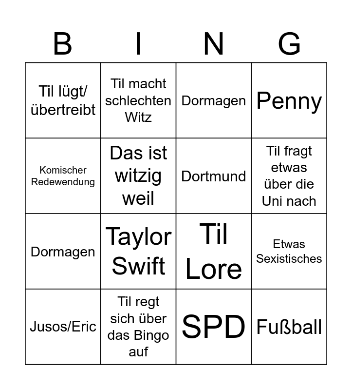 This bingo card has 19 words: Til Lore, Das ist witzig weil, Dormagen, Fußball, Etwas Sexistisches, Komischer Redewendung, SPD, Til lügt/übertreibt, Til macht schlechten Witz, Dormagen, Taylor Swift, Das ist witzig weil, Dortmund, Til regt sich über das Bingo auf, Jusos/Eric, Nudeln/Pesto, Penny, Til fragt etwas über die Uni nach and Irgendein Fußballspieler.