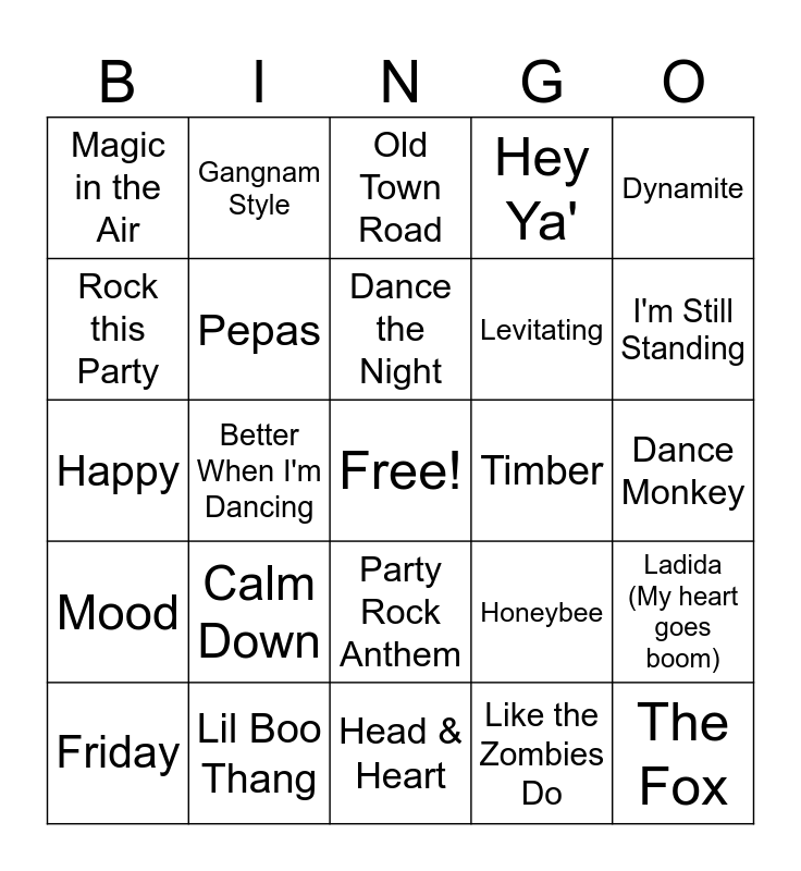 This bingo card has a free space and 24 words: Calm Down, Lil Boo Thang, Dance the Night, Friday, Dynamite, Magic in the Air, Rock this Party, Gangnam Style, Timber, Party Rock Anthem, Levitating, Happy, Honeybee, Ladida (My heart goes boom), Pepas, Like the Zombies Do, Dance Monkey, Old Town Road, I'm Still Standing, Better When I'm Dancing, The Fox, Mood, Hey Ya' and Head & Heart.