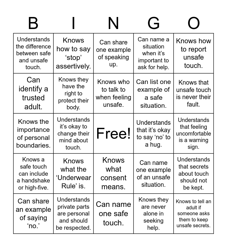 This bingo card has a free space and 25 words: Knows what the ‘Underwear Rule’ is., Can name one safe touch., Knows who to talk to when feeling unsafe., Can share an example of saying ‘no.’, Knows how to report unsafe touch., Understands the difference between safe and unsafe touch., Can identify a trusted adult., Knows how to say ‘stop’ assertively., Understands that it’s okay to say ‘no’ to a hug., Knows what consent means., Can list one example of a safe situation., Knows the importance of personal boundaries., Can name one example of an unsafe situation., Understands that secrets about touch should not be kept., Knows they have the right to protect their body., Can explain how to get help if needed., Understands that feeling uncomfortable is a warning sign., Can share one example of speaking up., Knows that unsafe touch is never their fault., Understands it’s okay to change their mind about touch., Knows to tell an adult if someone asks them to keep unsafe secrets., Understands private parts are personal and should be respected., Knows a safe touch can include a handshake or high-five., Can name a situation when it’s important to ask for help. and Knows they are never alone in seeking help..