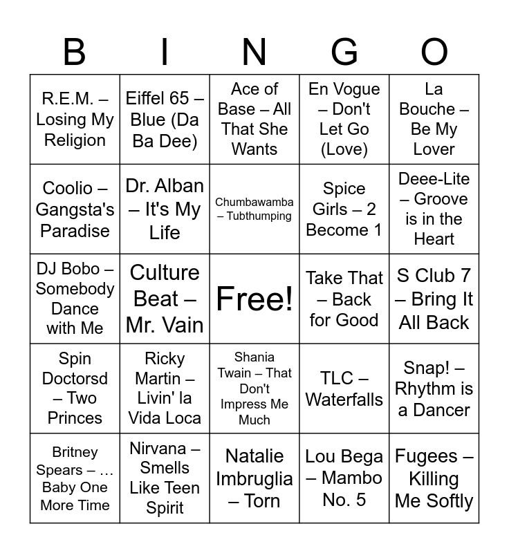 This bingo card has a free space and 74 words: 2 Unlimited – No Limit, 2pac – California Love, Ace of Base – All That She Wants, Alanis Morissette – Ironic, Alannah Myles – Black Velvet, All Saints – Never Ever, Aqua – Barbie Girl, Backstreet Boys – I Want It That Way, Britney Spears – …Baby One More Time, Celine Dion – My Heart Will Go On, Cher – Believe, Christina Aguilera – Genie in a Bottle, Chumbawamba – Tubthumping, Coolio – Gangsta's Paradise, Corona – The Rhythm of the Night, Culture Beat – Mr. Vain, Daft Punk – Around the World, Deee-Lite – Groove is in the Heart, Destiny’s Child – Say My Name, DJ Bobo – Somebody Dance with Me, Dr. Alban – It's My Life, Eiffel 65 – Blue (Da Ba Dee), En Vogue – Don't Let Go (Love), Five – Keep On Movin', Fugees – Killing Me Softly, George Michael – Freedom! 90, Haddaway – What Is Love, Hanson – MMMBop, Jennifer Lopez – If You Had My Love, Kris Kross – Jump, La Bouche – Be My Lover, Lauryn Hill – Doo Wop (That Thing), Lenny Kravitz – Fly Away, Londonbeat – I’ve been thinking about you, Los del Rio – Macarena, Lou Bega – Mambo No. 5, Mark Morrison – Return of the Mack, MC Hammer – U Can’t Touch This, Michael Jackson – Black or White, Mike + The Mechanics – Over My Shoulder, Natalie Imbruglia – Torn, Nirvana – Smells Like Teen Spirit, No Doubt – Don't Speak, NSYNC – Tearin' Up My Heart, Oasis – Wonderwall, R.E.M. – Losing My Religion, Rednex – Cotton Eye Joe, Ricky Martin – Livin' la Vida Loca, Right Said Fred – I’m too sexy, Robbie Williams – Let Me Entertain You, Robyn – Show Me Love, Roxette – Joyride, S Club 7 – Bring It All Back, Sash! – Ecuador, Savage Garden – Truly Madly Deeply, Scatman John – Scatman, Shania Twain – That Don't Impress Me Much, Sheryl Crow – If it Makes you happy, Sixpence None The Richer – Kiss Me, Snap! – Rhythm is a Dancer, Spice Girls – 2 Become 1, Spice Girls – Wannabe, Spin Doctorsd – Two Princes, Stardust – Music Sounds Better With You, Take That – Back for Good, Technotronic – Pump Up the Jam, The Cranberries – Zombie, The Offspring – Pretty Fly (For a White Guy), TLC – Waterfalls, UB40 – Can't Help Falling in Love, Vanilla Ice – Ice Ice Baby, Vengaboys – Boom, Boom, Boom, Boom!!, Whitney Houston – I Will Always Love You and Will Smith – Gettin' Jiggy wit It.