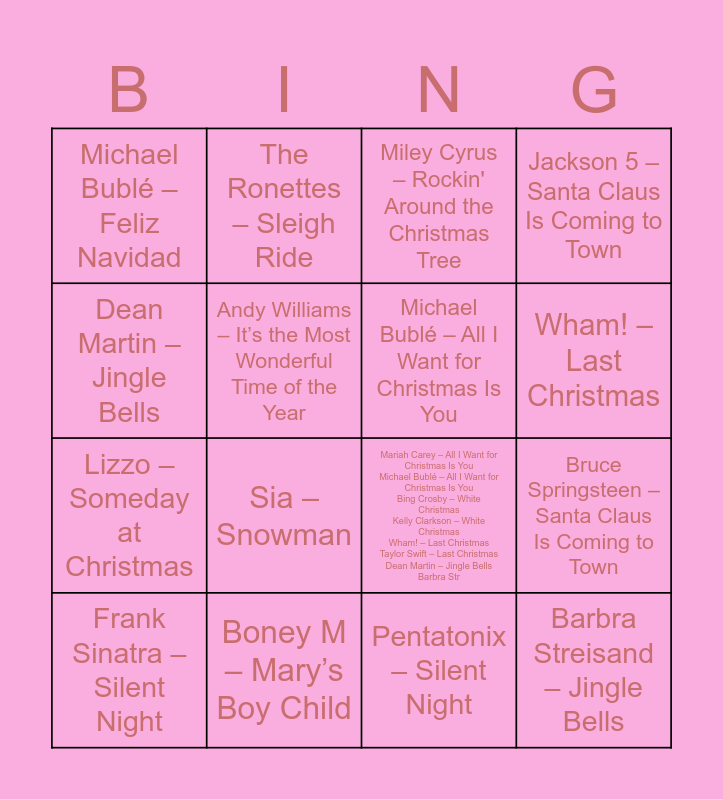 This bingo card has 41 words: Free!, Mariah Carey – All I Want for Christmas Is You Michael Bublé – All I Want for Christmas Is You Bing Crosby – White Christmas Kelly Clarkson – White Christmas Wham! – Last Christmas Taylor Swift – Last Christmas Dean Martin – Jingle Bells Barbra Str, Mariah Carey – All I Want for Christmas Is You, Michael Bublé – All I Want for Christmas Is You, Bing Crosby – White Christmas, Kelly Clarkson – White Christmas, Wham! – Last Christmas, Taylor Swift – Last Christmas, Dean Martin – Jingle Bells, Barbra Streisand – Jingle Bells, Bruce Springsteen – Santa Claus Is Coming to Town, Jackson 5 – Santa Claus Is Coming to Town, Frank Sinatra – Silent Night, Pentatonix – Silent Night, Boney M – Mary’s Boy Child, Harry Belafonte – Mary’s Boy Child, José Feliciano – Feliz Navidad, Michael Bublé – Feliz Navidad, Brenda Lee – Rockin' Around the Christmas Tree, Miley Cyrus – Rockin' Around the Christmas Tree, John Lennon & Yoko Ono – Happy Xmas (War Is Over), Céline Dion – Happy Xmas (War Is Over), Elton John – Step Into Christmas, Lizzo – Someday at Christmas, Nat King Cole – The Christmas Song, Christina Aguilera – The Christmas Song, Elvis Presley – Blue Christmas, Kelly Clarkson – Blue Christmas, Sia – Snowman, Idina Menzel – Let It Snow! Let It Snow! Let It Snow!, Meghan Trainor – I’ll Be Home, The Ronettes – Sleigh Ride, Ariana Grande – Santa Tell Me, Bing Crosby & David Bowie – Peace on Earth/Little Drummer Boy, Josh Groban – Believe, Andy Williams – It’s the Most Wonderful Time of the Year, Shakin' Stevens – Merry Christmas Everyone, Paul McCartney – Wonderful Christmastime, Katy Perry – Cozy Little Christmas, Stevie Wonder – What Christmas Means to Me and Darlene Love – Christmas (Baby Please Come Home).