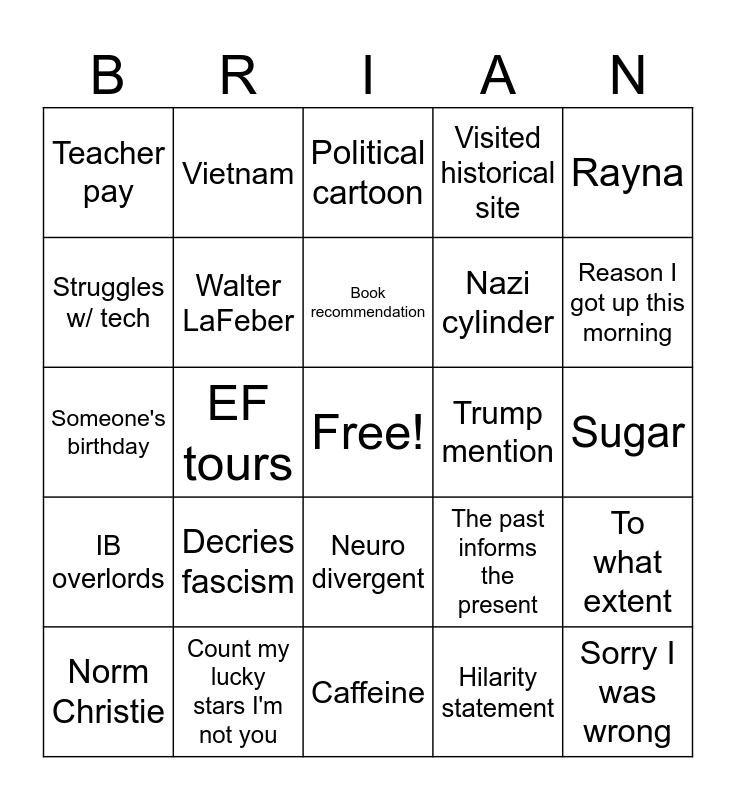 This bingo card has a free space and 33 words: Sits Down, I want to terrify you, EF tours, Cussing, IB overlords, Walter LaFeber, Rayna, Norm Christie, Vietnam, Roosevelt, Book recommendation, Political cartoon, Anger issues, Hypocrisy, Trump mention, Reason I got up this morning, Count my lucky stars I'm not you, Someone's birthday, Decries fascism, The past informs the present, Neuro divergent, Socialism, Teacher pay, Sugar, Caffeine, Sorry I was wrong, Visited historical site, Nazi cylinder, Struggles w/ tech, To what extent, The world is ending, Hilarity statement and Group Therapy.