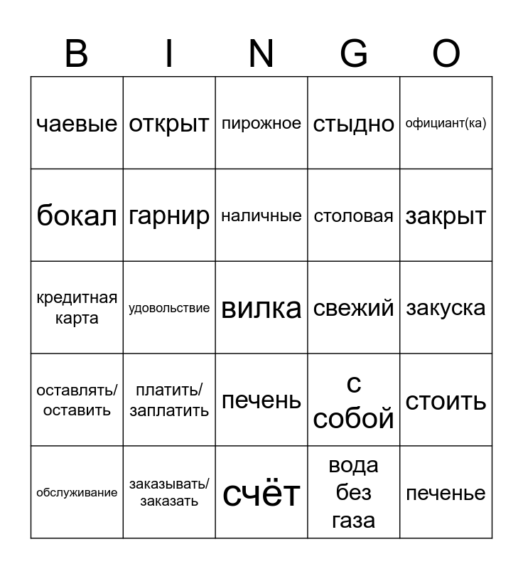 This bingo card has 25 words: платить/заплатить, счёт, наличные, обслуживание, официант(ка), чаевые, бокал, открыт, свежий, печень, столовая, кредитная карта, с собой, стоить, гарнир, печенье, закуска, пирожное, закрыт, удовольствие, вилка, заказывать/заказать, оставлять/оставить, стыдно and вода без газа.