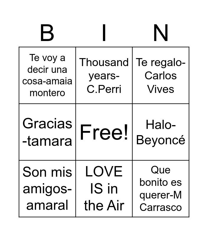 This bingo card has a free space and 23 words: Happy-Pharrell Williams, Sugar- marrón 5, LOVE IS in the Air, Sabor de amor...., Que bonito es querer-M Carrasco, Te voy a decir una cosa-amaia montero, Halo-Beyoncé, Thousand years-C.Perri, Titanium-Sia, All of me-j.Legend, Paradise- coldplay, Cancion bonita-C.vives, Solo si es contigo - Bombai, Familia-Funambulista, De Perreo- Marlon, Por ti- canto del loco, Te regalo- Carlos Vives, Girls just want to hace fun- c.lauper, Son mis amigos-amaral, Always bon Jovi, Gracias -tamara, Cant take my eyes of you and Estoy hecho de pedacitos de ti- Orozco.