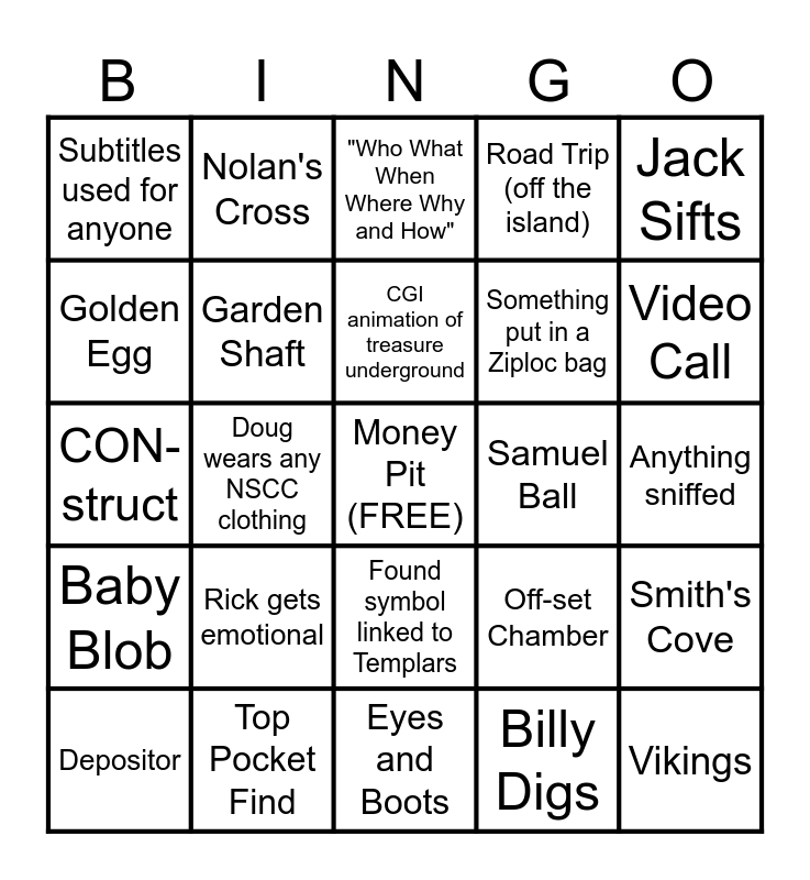 This bingo card has a free space and 24 words: Rick gets emotional, Top Pocket Find, CGI animation of treasure underground, Depositor, Jack Sifts, Subtitles used for anyone, Golden Egg, Nolan's Cross, Samuel Ball, Found symbol linked to Templars, Something put in a Ziploc bag, CON-struct, Off-set Chamber, Smith's Cove, Garden Shaft, Billy Digs, Anything sniffed, "Who What When Where Why and How", Video Call, Doug wears any NSCC clothing, Vikings, Baby Blob, Road Trip (off the island) and Eyes and Boots.