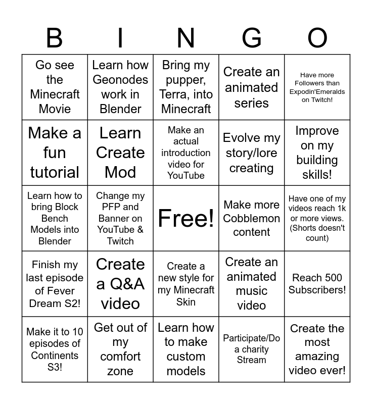 This bingo card has a free space and 24 words: Make it to 10 episodes of Continents S3!, Create a Q&A video, Make an actual introduction video for YouTube, Participate/Do a charity Stream, Have more Followers than Expodin'Emeralds on Twitch!, Go see the Minecraft Movie, Learn how Geonodes work in Blender, Bring my pupper, Terra, into Minecraft, Make more Cobblemon content, Have one of my videos reach 1k or more views. (Shorts doesn't count), Learn how to bring Block Bench Models into Blender, Learn Create Mod, Create an animated music video, Reach 500 Subscribers!, Make a fun tutorial, Get out of my comfort zone, Learn how to make custom models, Create an animated series, Improve on my building skills!, Finish my last episode of Fever Dream S2!, Change my PFP and Banner on YouTube & Twitch, Create a new style for my Minecraft Skin, Evolve my story/lore creating and Create the most amazing video ever!.