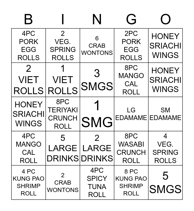 This bingo card has a free space and 24 words: 5 LARGE DRINKS, 2 CRAB WONTONS, 3 SMGS, 4 PC KUNG PAO SHRIMP ROLL, HONEY SRIACHI WINGS, 4PC PORK EGG ROLLS, 2 VIET ROLLS, 2 VEG. SPRING ROLLS, LG EDAMAME, 2 LARGE DRINKS, 8PC MANGO CAL ROLL, HONEY SRIACHI WINGS, 8PC WASABI CRUNCH ROLL, 4 VEG. SPRING ROLLS, 1 VIET ROLLS, 8 PC KUNG PAO SHRIMP ROLL, SM EDAMAME, 6 CRAB WONTONS, HONEY SRIACHI WINGS, 8PC TERIYAKI CRUNCH ROLL, 5 SMGS, 4PC MANGO CAL ROLL, 2PC PORK EGG ROLLS and 4PC SPICY TUNA ROLL.