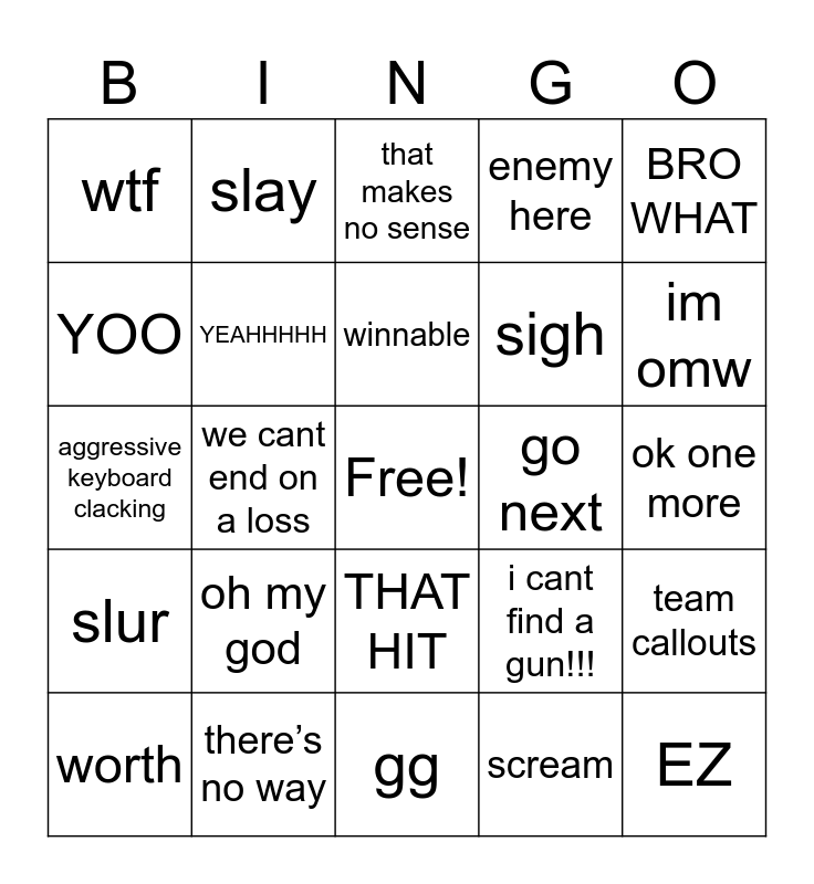 This bingo card has a free space and 24 words: oh my god, there’s no way, winnable, worth, BRO WHAT, wtf, YOO, slay, go next, THAT HIT, sigh, aggressive keyboard clacking, i cant find a gun!!!, team callouts, YEAHHHHH, scream, ok one more, that makes no sense, im omw, we cant end on a loss, EZ, slur, enemy here and gg.