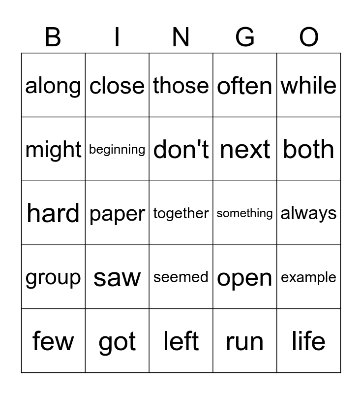 This bingo card has 25 words: saw, left, don't, few, while, along, might, close, something, seemed, next, hard, open, example, beginning, life, always, those, both, paper, together, got, group, often and run.