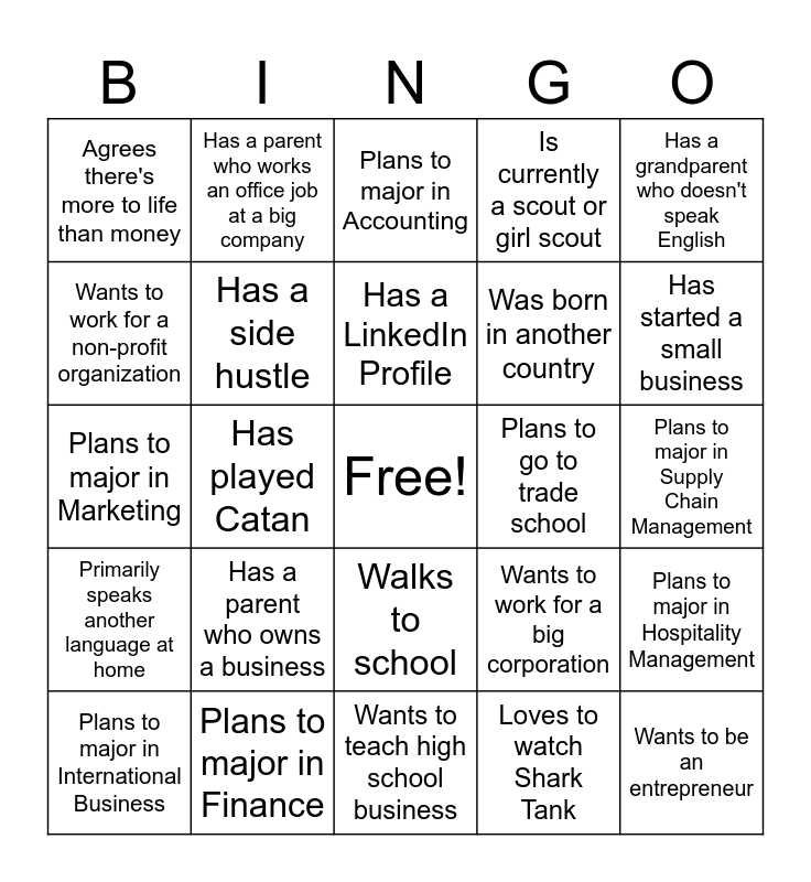 This bingo card has a free space and 24 words: Has a parent who owns a business, Plans to major in Finance, Has a LinkedIn Profile, Plans to major in International Business, Has a grandparent who doesn't speak English, Agrees there's more to life than money, Wants to work for a non-profit organization, Has a parent who works an office job at a big company, Plans to go to trade school, Walks to school, Was born in another country, Plans to major in Marketing, Wants to work for a big corporation, Plans to major in Hospitality Management, Has a side hustle, Loves to watch Shark Tank, Plans to major in Supply Chain Management, Plans to major in Accounting, Has started a small business, Has played Catan, Wants to be an entrepreneur, Primarily speaks another language at home, Is currently a scout or girl scout and Wants to teach high school business.