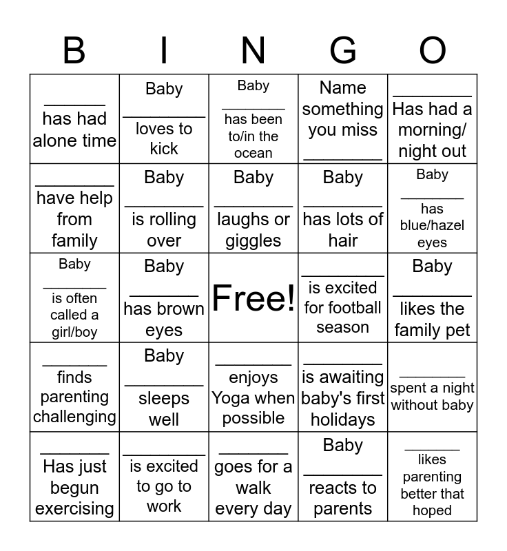 This bingo card has a free space and 24 words: Baby ________ sleeps well, _________ is excited to go to work, Baby ________ laughs or giggles, _______ Has just begun exercising, ________ Has had a morning/ night out, ______ has had alone time, ________ have help from family, Baby _________ loves to kick, _________ is excited for football season, ________ enjoys Yoga when possible, Baby ________ has lots of hair, Baby ________ is often called a girl/boy, ________ is awaiting baby's first holidays, ________ spent a night without baby, Baby ________ is rolling over, Baby ________ reacts to parents, Baby ________ likes the family pet, Baby ________ has been to/in the ocean, Baby ________ has blue/hazel eyes, Baby _______ has brown eyes, _______ likes parenting better that hoped, _______ finds parenting challenging, Name something you miss ________ and _______ goes for a walk every day.