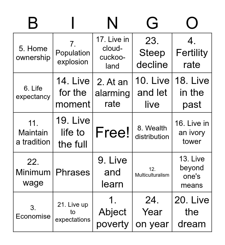 This bingo card has a free space and 25 words: Phrases, 1. Abject poverty, 2. At an alarming rate, 3. Economise, 4. Fertility rate, 5. Home ownership, 6. Life expectancy, 7. Population explosion, 8. Wealth distribution, 9. Live and learn, 10. Live and let live, 11. Maintain a tradition, 12. Multiculturalism, 13. Live beyond one's means, 14. Live for the moment, 15. Live hand to mouth, 16. Live in an ivory tower, 17. Live in cloud-cuckoo-land, 18. Live in the past, 19. Live life to the full, 20. Live the dream, 21. Live up to expectations, 22. Minimum wage, 23. Steep decline and 24. Year on year.