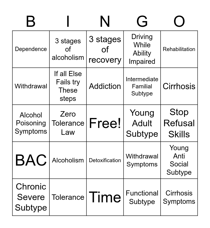 This bingo card has a free space and 24 words: Alcoholism, Tolerance, Addiction, Chronic Severe Subtype, Rehabilitation, Dependence, Withdrawal, 3 stages of alcoholism, Young Adult Subtype, Detoxification, Intermediate Familial Subtype, Alcohol Poisoning Symptoms, Withdrawal Symptoms, Young Anti Social Subtype, If all Else Fails try These steps, Functional Subtype, Stop Refusal Skills, 3 stages of recovery, Cirrhosis, Zero Tolerance Law, Cirrhosis Symptoms, BAC, Driving While Ability Impaired and Time.