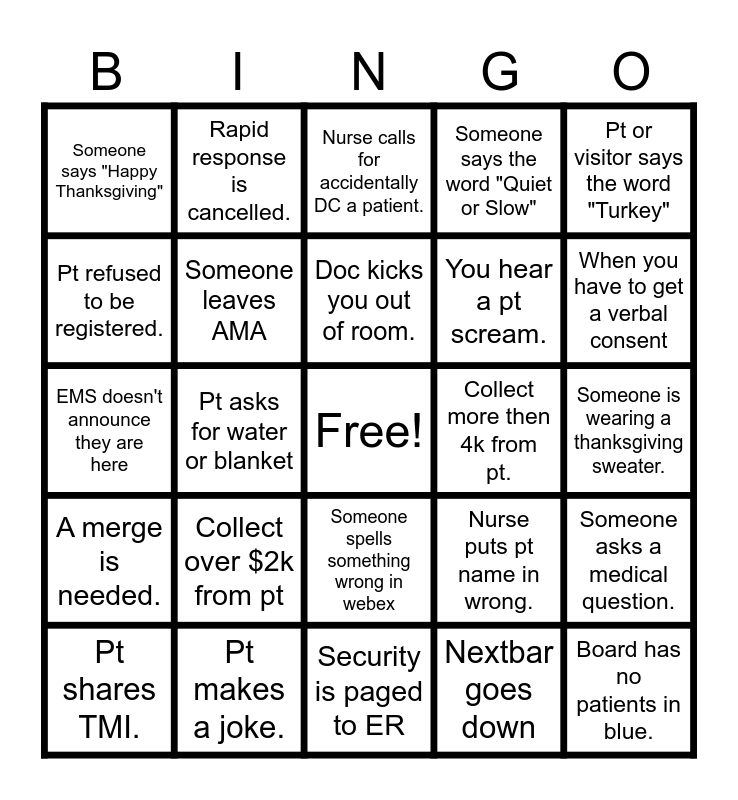 This bingo card has a free space and 24 words: Collect over $2k from pt, Pt makes a joke., Doc kicks you out of room., Pt shares TMI., Pt or visitor says the word "Turkey", Someone says "Happy Thanksgiving", Pt refused to be registered., Rapid response is cancelled., Collect more then 4k from pt., Someone spells something wrong in webex, You hear a pt scream., EMS doesn't announce they are here, Nurse puts pt name in wrong., Someone asks a medical question., Someone leaves AMA, Nextbar goes down, Someone is wearing a thanksgiving sweater., Nurse calls for accidentally DC a patient., When you have to get a verbal consent, Pt asks for water or blanket, Board has no patients in blue., A merge is needed., Someone says the word "Quiet or Slow" and Security is paged to ER.
