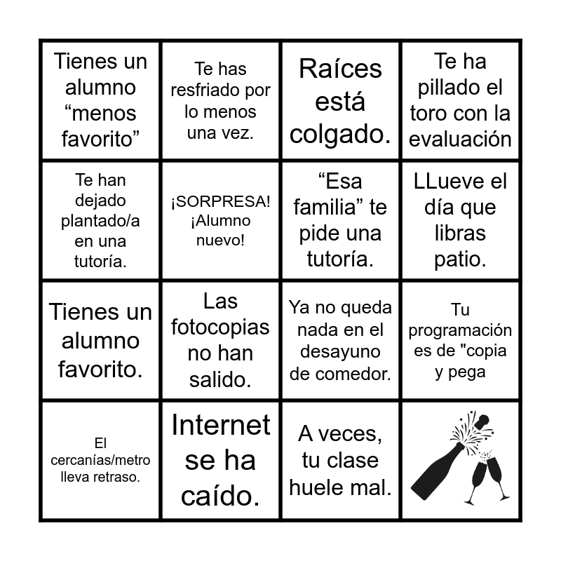 This bingo card has 2 images and 21 words: LLueve el día que libras patio., “Ese alumno/a” aparece a 2ª hora., Te han dejado plantado/a en una tutoría., Tienes un alumno “menos favorito”, ¡SORPRESA! ¡Alumno nuevo!, Te has resfriado por lo menos una vez., El cercanías/metro lleva retraso., Una familia quiere comentarte algo “rápido” a la salida., Las fotocopias no han salido., Tienes un alumno favorito., Te han llamado “mamá/papá”, El claustro se alarga., Internet se ha caído., Te has olvidado el USB., Raíces está colgado., Ya no queda nada en el desayuno de comedor., “Esa familia” te pide una tutoría., Tu programación es de "copia y pega, Te ha pillado el toro con la evaluación, A veces, tu clase huele mal. and Las tablets están descargadas..