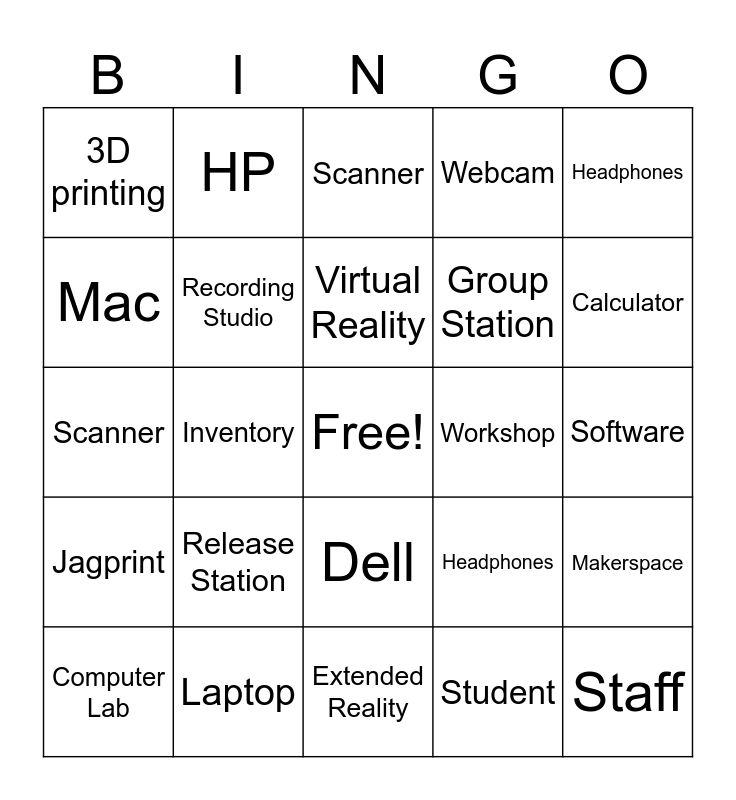 This bingo card has a free space and 29 words: Computer, Laptop, Scanner, Printer, Headphones, 3D printing, Recording Studio, Virtual Reality, Workshop, Makerspace, Computer Lab, Inventory, Student, Staff, Scanner, Open Labs, Extended Reality, Headphones, Calculator, Jagprint, Release Station, Wi-fi, Group Station, Software, Mac, HP, Dell, Webcam and Blackboard.