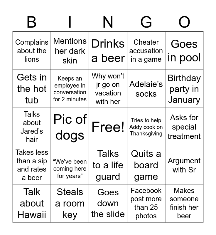 This bingo card has a free space and 24 words: “We’ve been coming here for years”, Steals a room key, Why won’t jr go on vacation with her, Talk about Hawaii, Goes in pool, Complains about the lions, Gets in the hot tub, Mentions her dark skin, Tries to help Addy cook on Thanksgiving, Talks to a life guard, Adelaie’s socks, Talks about Jared’s hair, Quits a board game, Argument with Sr, Keeps an employee in conversation for 2 minutes, Facebook post more than 25 photos, Asks for special treatment, Drinks a beer, Birthday party in January, Pic of dogs, Makes someone finish her beer, Takes less than a sip and rates a beer, Cheater accusation in a game and Goes down the slide.