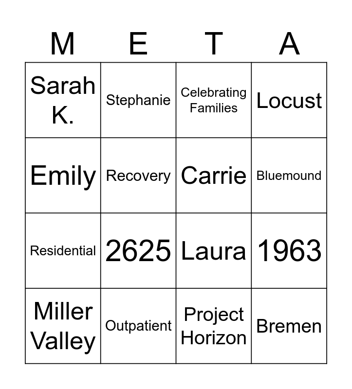 This bingo card has 24 words: Riverwest, Sidnee, Bluemound, Jessie, Emily, Sarah K., Recovery, Stephanie, Outpatient, Molly, Residential, Laura, Carey, Weil, Carrie, Piggsville, Project Horizon, Celebrating Families, 2625, 1963, Miller Valley, Bremen, Locust and First.