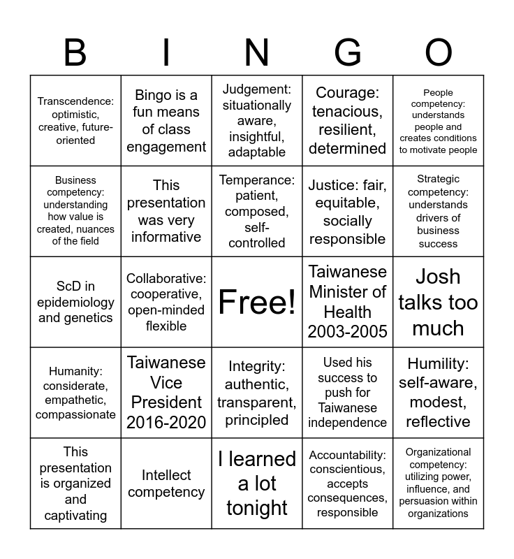 This bingo card has a free space and 24 words: Taiwanese Vice President 2016-2020, Intellect competency, Temperance: patient, composed, self-controlled, This presentation is organized and captivating, People competency: understands people and creates conditions to motivate people, Transcendence: optimistic, creative, future-oriented, Business competency: understanding how value is created, nuances of the field, Bingo is a fun means of class engagement, Taiwanese Minister of Health 2003-2005, Integrity: authentic, transparent, principled, Justice: fair, equitable, socially responsible, ScD in epidemiology and genetics, Used his success to push for Taiwanese independence, Humility: self-aware, modest, reflective, This presentation was very informative, Accountability: conscientious, accepts consequences, responsible, Josh talks too much, Judgement: situationally aware, insightful, adaptable, Strategic competency: understands drivers of business success, Collaborative: cooperative, open-minded flexible, Organizational competency: utilizing power, influence, and persuasion within organizations, Humanity: considerate, empathetic, compassionate, Courage: tenacious, resilient, determined and I learned a lot tonight.