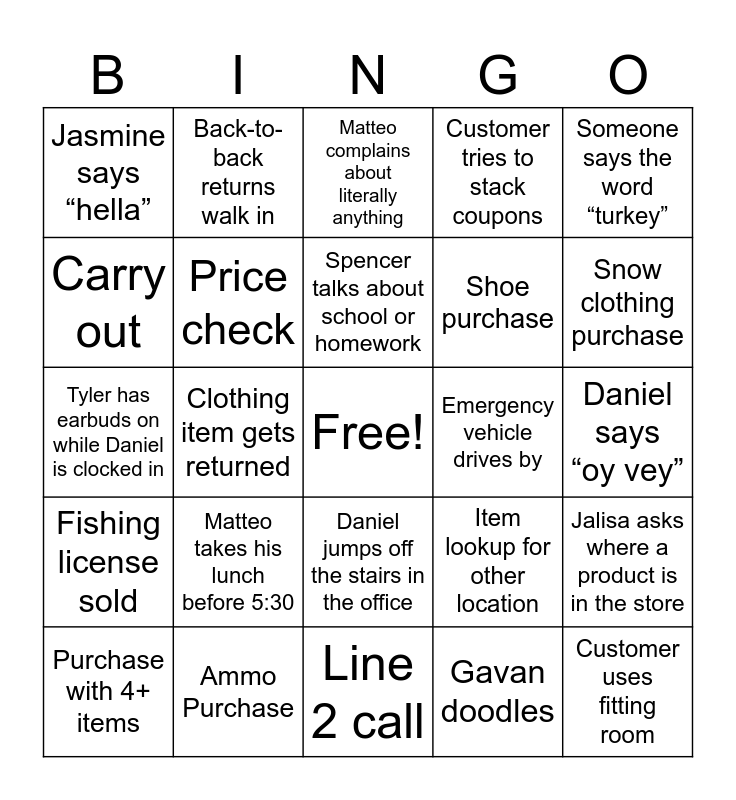This bingo card has a free space and 24 words: Matteo takes his lunch before 5:30, Ammo Purchase, Spencer talks about school or homework, Purchase with 4+ items, Someone says the word “turkey”, Jasmine says “hella”, Carry out, Back-to-back returns walk in, Emergency vehicle drives by, Daniel jumps off the stairs in the office, Shoe purchase, Tyler has earbuds on while Daniel is clocked in, Item lookup for other location, Jalisa asks where a product is in the store, Price check, Gavan doodles, Daniel says “oy vey”, Matteo complains about literally anything, Snow clothing purchase, Clothing item gets returned, Customer uses fitting room, Fishing license sold, Customer tries to stack coupons and Line 2 call.