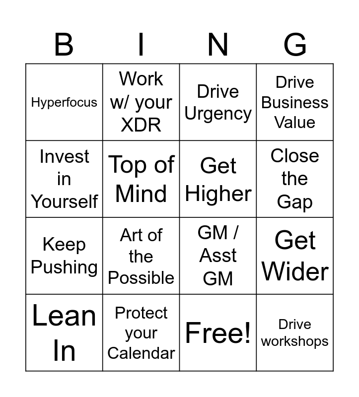 This bingo card has 17 words: Free!, Lean In, Drive Urgency, Hyperfocus, Art of the Possible, Drive Business Value, Get Wider, Get Higher, Close the Gap, Top of Mind, Protect your Calendar, GM / Asst GM, Invest in Yourself, Work w/ your XDR, Keep Pushing, Push Partners and Drive workshops.