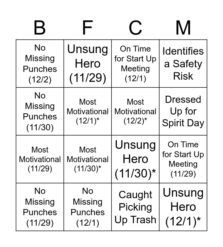 This bingo card has 20 words: On Time for Start Up Meeting (11/29), On Time for Start Up Meeting (11/30), On Time for Start Up Meeting (12/1), On Time for Start Up Meeting (12/2), No Missing Punches (11/29), No Missing Punches (11/30), No Missing Punches (12/1), No Missing Punches (12/2), Most Motivational (11/29), Unsung Hero (11/29), Most Motivational (11/30)*, Unsung Hero (11/30)*, Most Motivational (12/1)*, Unsung Hero (12/1)*, Most Motivational (12/2)*, Unsung Hero (12/2)*, Dressed Up for Spirit Day, Identifies a Safety Risk, Caught Picking Up Trash and BCM Perfect Attendance Weekend (11/29 – 12/2).
