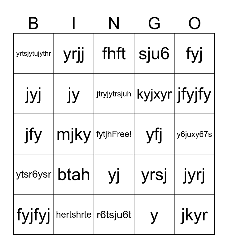 This bingo card has a free space and 24 words: btah, hertshrte, jtryjytrsjuh, fyjfyj, fyj, yrtsjytujythr, jyj, yrjj, yfj, yj, kyjxyr, jfy, yrsj, jyrj, jy, y, y6juxy67s, fhft, jfyjfy, mjky, jkyr, ytsr6ysr, sju6 and r6tsju6t.