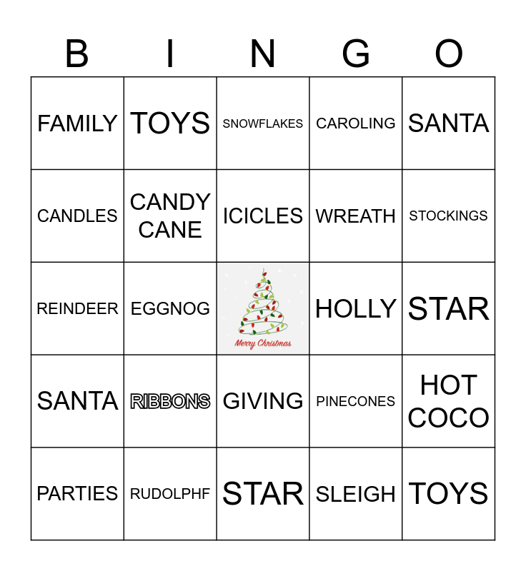 This bingo card has a free space and 24 words: RIBBONS, RUDOLPHF, ICICLES, PARTIES, SANTA, FAMILY, CANDLES, TOYS, HOLLY, GIVING, WREATH, REINDEER, PINECONES, HOT COCO, CANDY CANE, SLEIGH, STAR, SNOWFLAKES, STOCKINGS, EGGNOG, TOYS, SANTA, CAROLING and STAR.
