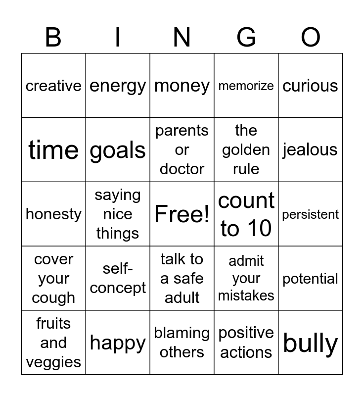 This bingo card has a free space and 24 words: self-concept, happy, parents or doctor, fruits and veggies, curious, creative, time, energy, count to 10, talk to a safe adult, the golden rule, honesty, admit your mistakes, potential, goals, positive actions, persistent, money, jealous, saying nice things, bully, cover your cough, memorize and blaming others.