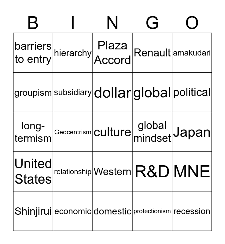 This bingo card has a free space and 43 words: quality, recession, internationalisation, Shinjirui, radical, protectionism, Plaza Accord, kaizen, amakudari, economic, Renault, global mindset, Western, relationship, price oriented, domestic, Europe, long-termism, diversity, political, hierarchy, collaboration, adaptability, barriers to entry, Nissan, Japan, Canon, home market, R&D, United States, change, MNE, integrate, Geocentrism, Ethnocentrism, endaka, Yen, dollar, groupism, global, FDI, subsidiary and region.