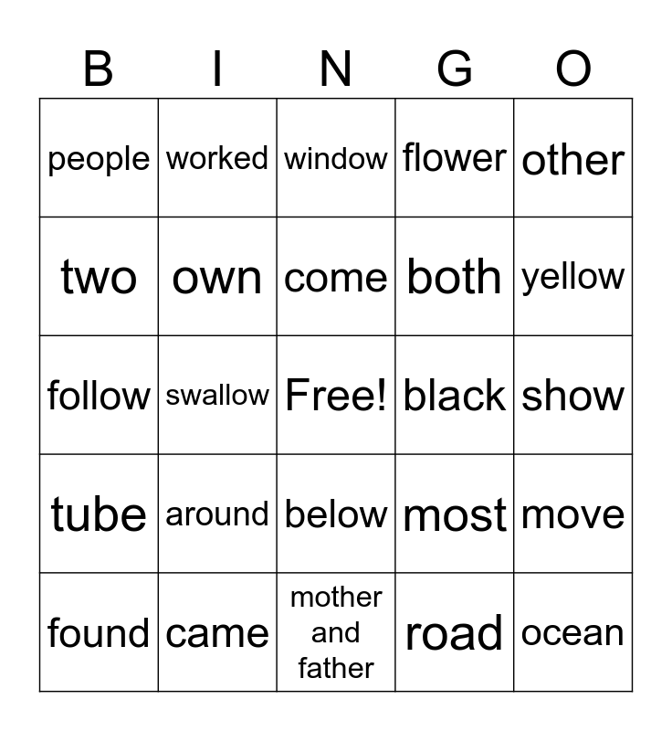 This bingo card has a free space and 24 words: around, came, come, found, other, people, two, worked, black, below, both, follow, most, move, own, road, show, window, yellow, swallow, ocean, tube, flower and mother and father.