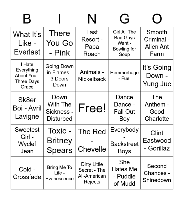 This bingo card has a free space and 30 words: Tipsy - J-Kwon, Bring Me To Life - Evanescence, Last Resort - Papa Roach, Fine Again - Seether, Smooth Criminal - Alien Ant Farm, What It’s Like - Everlast, Going Down in Flames - 3 Doors Down, Animals - Nickelback, Hemmorhage - Fuel, Second Chances - Shinedown, Cold - Crossfade, Toxic - Britney Spears, She Hates Me - Puddle of Mudd, Glycerine - Bush, Sweetest Girl - Wyclef Jean, Where the Party At? - Jagged Edge, Dirty Little Secret - The All-American Rejects, Dance Dance - Fall Out Boy, Clint Eastwood - Gorillaz, I Hate Everything About You - Three Days Grace, Down With The Sickness - Disturbed, In The End - Linkin Park, Girl All The Bad Guys Want - Bowling for Soup, The Anthem - Good Charlotte, Sk8er Boi - Avril Lavigne, There You Go - Pink, The Red - Chevelle, Everybody - Backstreet Boys, It’s Going Down - Yung Juc and Wonderwall - Oasis.