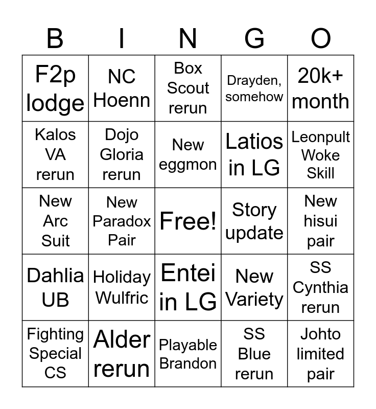 This bingo card has a free space and 24 words: Holiday Wulfric, Alder rerun, New eggmon, Fighting Special CS, 20k+ month, F2p lodge, Kalos VA rerun, NC Hoenn, Story update, Entei in LG, Latios in LG, New Arc Suit, New Variety, SS Cynthia rerun, Dojo Gloria rerun, SS Blue rerun, New hisui pair, Box Scout rerun, Leonpult Woke Skill, New Paradox Pair, Johto limited pair, Dahlia UB, Drayden, somehow and Playable Brandon.
