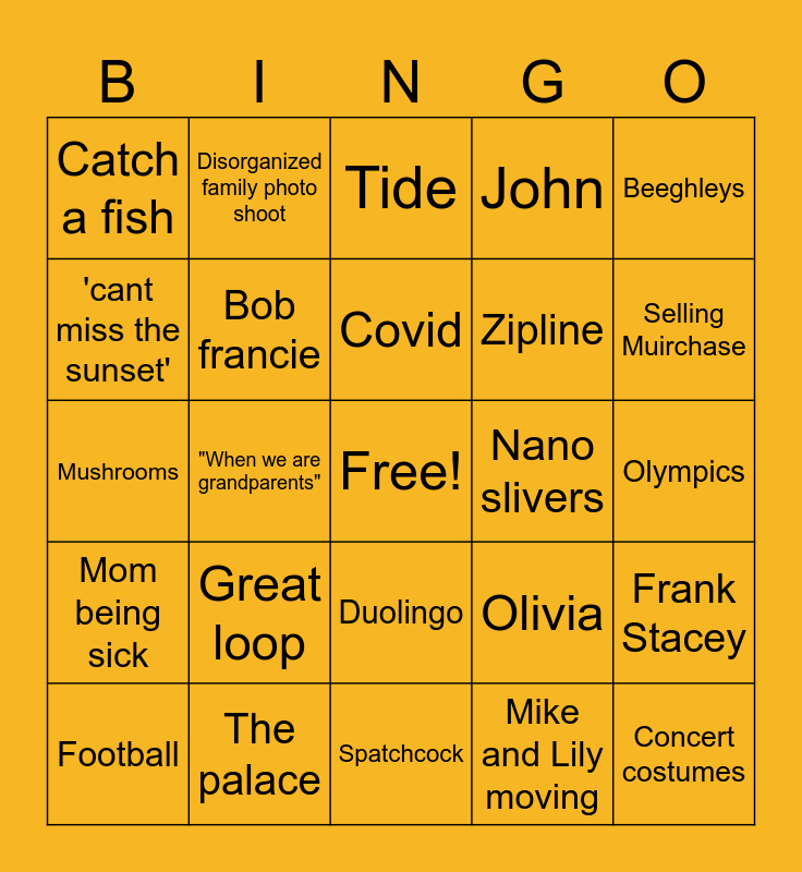 This bingo card has a free space and 47 words: Taylor Swift, Concert costumes, Grants retirement, Spatchcock, Great loop, Claire falls asleep with phone, Disorganized family photo shoot, Aperol spritz, 'cant miss the sunset', Making fun of last year, Bob francie, John, Frank Stacey, Olivia, Nicole, Rude comment about Muir's/ comstocks, Covid, Nano slivers, Jello, Beeghleys, "When we are grandparents", Mike and Lily moving, Catch a fish, Zipline, Keg, Selling Muirchase, Football, Golf, Duolingo, Mom being sick, Salt, Pee tea, Micheal pie, Pablo, Roxy dating, The palace, Olympics, Family Christmas/new years, Polar vortex, Basils appearance, Jodie, Tide, Mushrooms, Recent trip (Niagara, Cape, CT, Toronto), Espresso martini, Racist comment and Say spatchcock wrong.