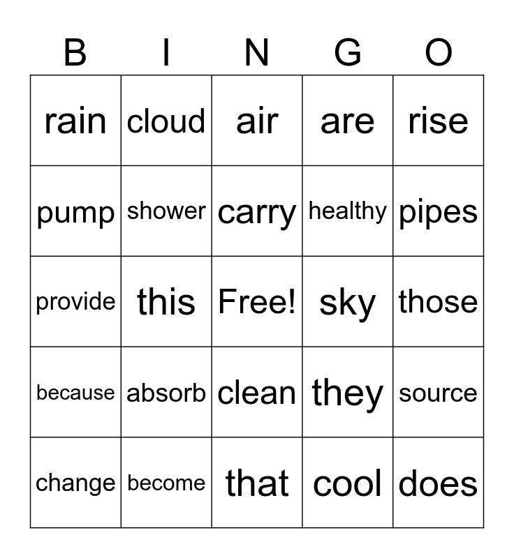 This bingo card has a free space and 24 words: absorb, become, carry, change, rise, rain, pump, cloud, sky, clean, healthy, provide, they, source, shower, cool, those, air, pipes, this, does, because, are and that.