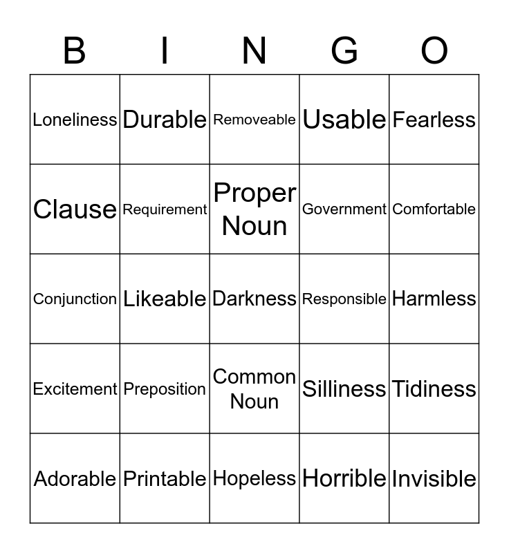 This bingo card has 25 words: Preposition, Hopeless, Proper Noun, Adorable, Fearless, Loneliness, Clause, Durable, Responsible, Common Noun, Government, Conjunction, Silliness, Tidiness, Requirement, Invisible, Harmless, Removeable, Comfortable, Likeable, Darkness, Printable, Excitement, Usable and Horrible.