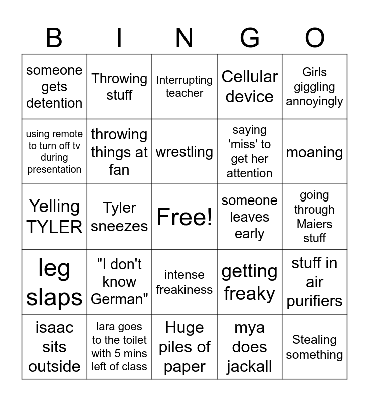 This bingo card has a free space and 36 words: Fans on extreme, Blaming tyler/andy, breaking chairs, throwing things at fan, getting freaky, leg slaps, wrestling, racist / homophobic comments, Girls giggling annoyingly, jumping out window, Tyler sneezes, Cellular device, Playing funny sounds, someone leaves early, moaning, someone gets detention, cheating in blooket, "I don't know German", Stealing something, Interrupting teacher, going through Maiers stuff, stuff in air purifiers, lara goes to the toilet with 5 mins left of class, isaac sits outside, Huge piles of paper, Throwing stuff, Yelling TYLER, not paying attention, saying 'miss' to get her attention, using remote to turn off tv during presentation, changing language on tv, someones computer gets stolen, mya does jackall, intense freakiness, eating in class and playing rpg games.