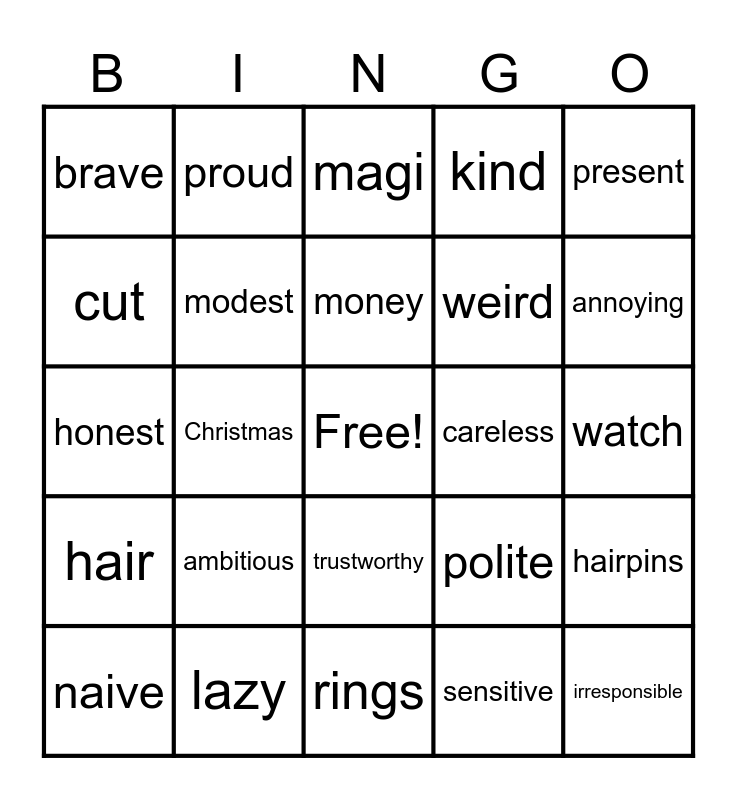 This bingo card has a free space and 24 words: ambitious, lazy, money, naive, present, brave, cut, proud, careless, trustworthy, weird, honest, polite, hairpins, modest, sensitive, watch, magi, annoying, Christmas, irresponsible, hair, kind and rings.