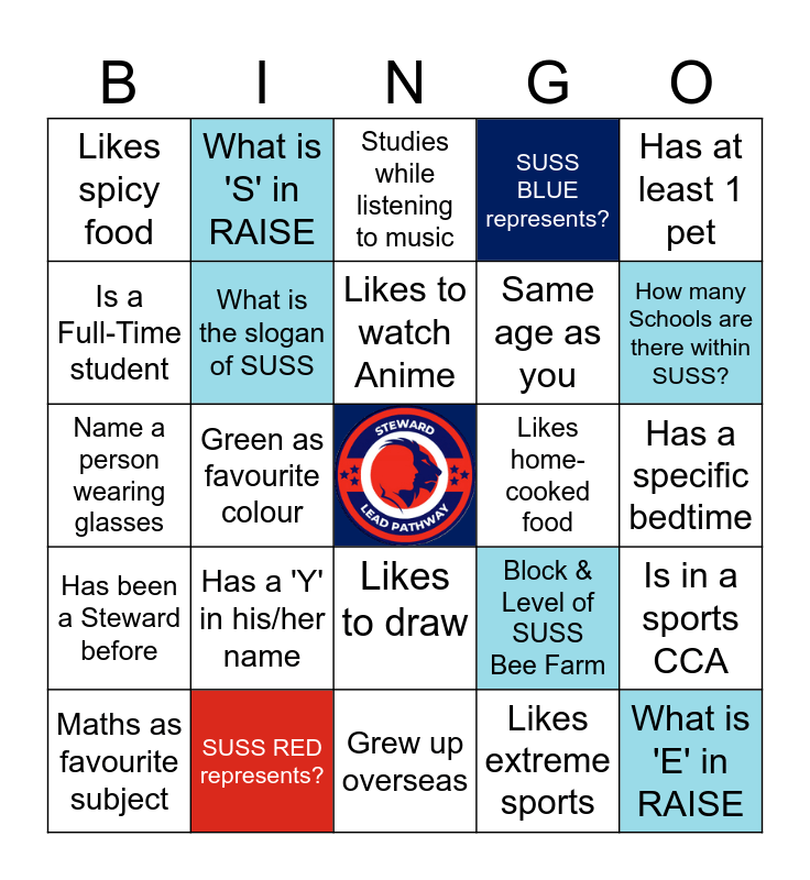 This bingo card has a free space and 24 words: Has a 'Y' in his/her name, SUSS RED represents?, Likes to watch Anime, Maths as favourite subject, Has at least 1 pet, Likes spicy food, Is a Full-Time student, What is 'S' in RAISE, Likes home-cooked food, Likes to draw, Same age as you, Name a person wearing glasses, Block & Level of SUSS Bee Farm, Is in a sports CCA, What is the slogan of SUSS, Likes extreme sports, Has a specific bedtime, Studies while listening to music, How many Schools are there within SUSS?, Green as favourite colour, What is 'E' in RAISE, Has been a Steward before, SUSS BLUE represents? and Grew up overseas.