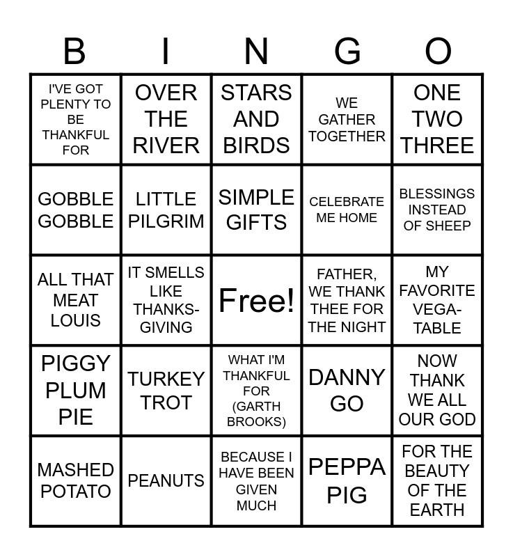 This bingo card has a free space and 24 words: TURKEY TROT, PEANUTS, SIMPLE GIFTS, MASHED POTATO, ONE TWO THREE, I'VE GOT PLENTY TO BE THANKFUL FOR, GOBBLE GOBBLE, OVER THE RIVER, FATHER, WE THANK THEE FOR THE NIGHT, WHAT I'M THANKFUL FOR (GARTH BROOKS), CELEBRATE ME HOME, ALL THAT MEAT LOUIS, DANNY GO, NOW THANK WE ALL OUR GOD, LITTLE PILGRIM, PEPPA PIG, MY FAVORITE VEGA-TABLE, STARS AND BIRDS, BLESSINGS INSTEAD OF SHEEP, IT SMELLS LIKE THANKS-GIVING, FOR THE BEAUTY OF THE EARTH, PIGGY PLUM PIE, WE GATHER TOGETHER and BECAUSE I HAVE BEEN GIVEN MUCH.