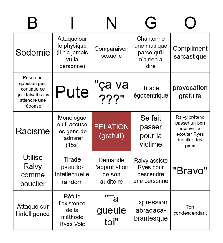 This bingo card has a free space and 34 words: Utilise Ralvy comme punching ball, Expression abradaca-brantesque, "oh lolololo...", Se met sarcastiquement d'accord avec son interlocuteur, Utilise Ralvy comme bouclier, Pute, Compliment sarcastique, Attaque sur l'intelligence, Attaque sur le physique (il n'a jamais vu la personne), Insiste à répétition sur la même insulte, "ça va ???", Comparaison sexuelle, Ton terriblement outré, Se sent offusqué par une remarque banale, Se fait passer pour la victime, provocation gratuite, Réfute l'existence de la méthode Ryes Volc, Racisme, Tirade pseudo-intellectuelle random, Ralvy assiste Ryes pour descendre une personne, Demande l'approbation de son auditoire, Pose une question à son interlocuteur pour le descendre juste après, Sodomie, Ralvy prétend passer un bon moment à écouter Ryes insulter des gens, "Ta gueule toi", Ton condescendant, Chantonne une musique parce qu'il n'a rien à dire, Métaphore homophobe, Tirade égocentrique, Pose une question puis continue ce qu'il faisait sans attendre une réponse, Référence politique française désuette, Monologue où il accuse les gens de l'admirer (15s), "Bravo" and Ralvy utilise inconsciemment les maneurismes de Ryes.