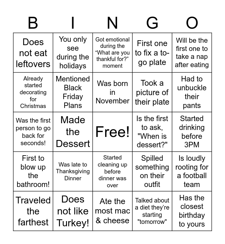 This bingo card has a free space and 24 words: Was late to Thanksgiving Dinner, Does not like Turkey!, Was born in November, Traveled the farthest, Will be the first one to take a nap after eating, Does not eat leftovers, Already started decorating for Christmas, You only see during the holidays, Is the first to ask, "When is dessert?", Started cleaning up before dinner was over, Took a picture of their plate, Was the first person to go back for seconds!, Spilled something on their outfit, Is loudly rooting for a football team, Mentioned Black Friday Plans, Talked about a diet they’re starting "tomorrow", Started drinking before 3PM, Got emotional during the “What are you thankful for?” moment, Had to unbuckle their pants, Made the Dessert, Has the closest birthday to yours, First to blow up the bathroom!, First one to fix a to-go plate and Ate the most mac & cheese.