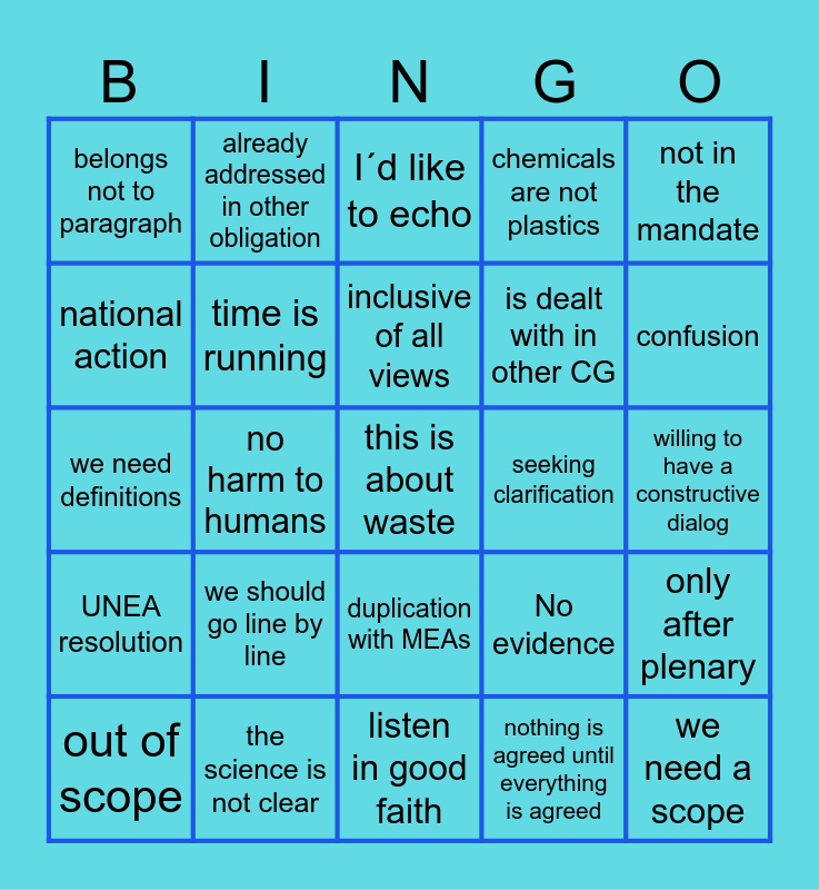 This bingo card has a free space and 24 words: we should go line by line, the science is not clear, inclusive of all views, out of scope, not in the mandate, belongs not to paragraph, national action, already addressed in other obligation, seeking clarification, duplication with MEAs, is dealt with in other CG, we need definitions, No evidence, only after plenary, time is running, nothing is agreed until everything is agreed, willing to have a constructive dialog, I´d like to echo, confusion, no harm to humans, we need a scope, UNEA resolution, chemicals are not plastics and listen in good faith.